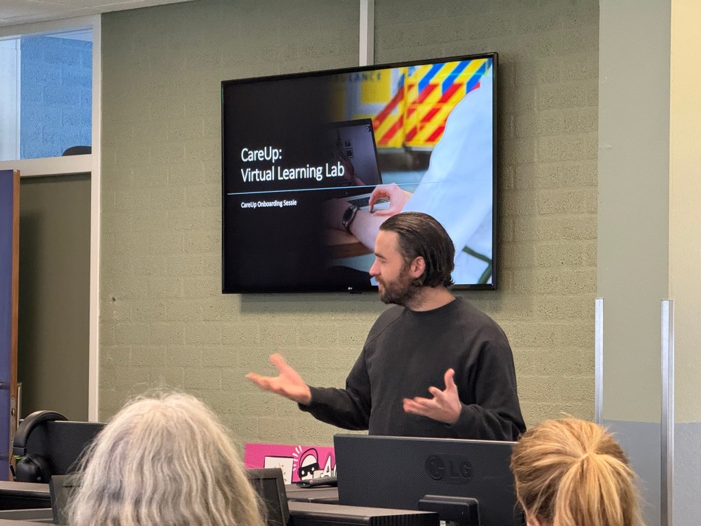 Vandaag bracht een groep partners van RIF-SMART een inspirerende ochtend door met Gijs en Jos van CareUp. In een klaslokaal boordevol zorg- en onderwijsprofessionals maakten we kennis met de mogelijkheden van CareUp, een innovatieve leeromgeving die praktijkleren en theorie combineert, ideaal voor opleiding en bijscholing in de zorg.